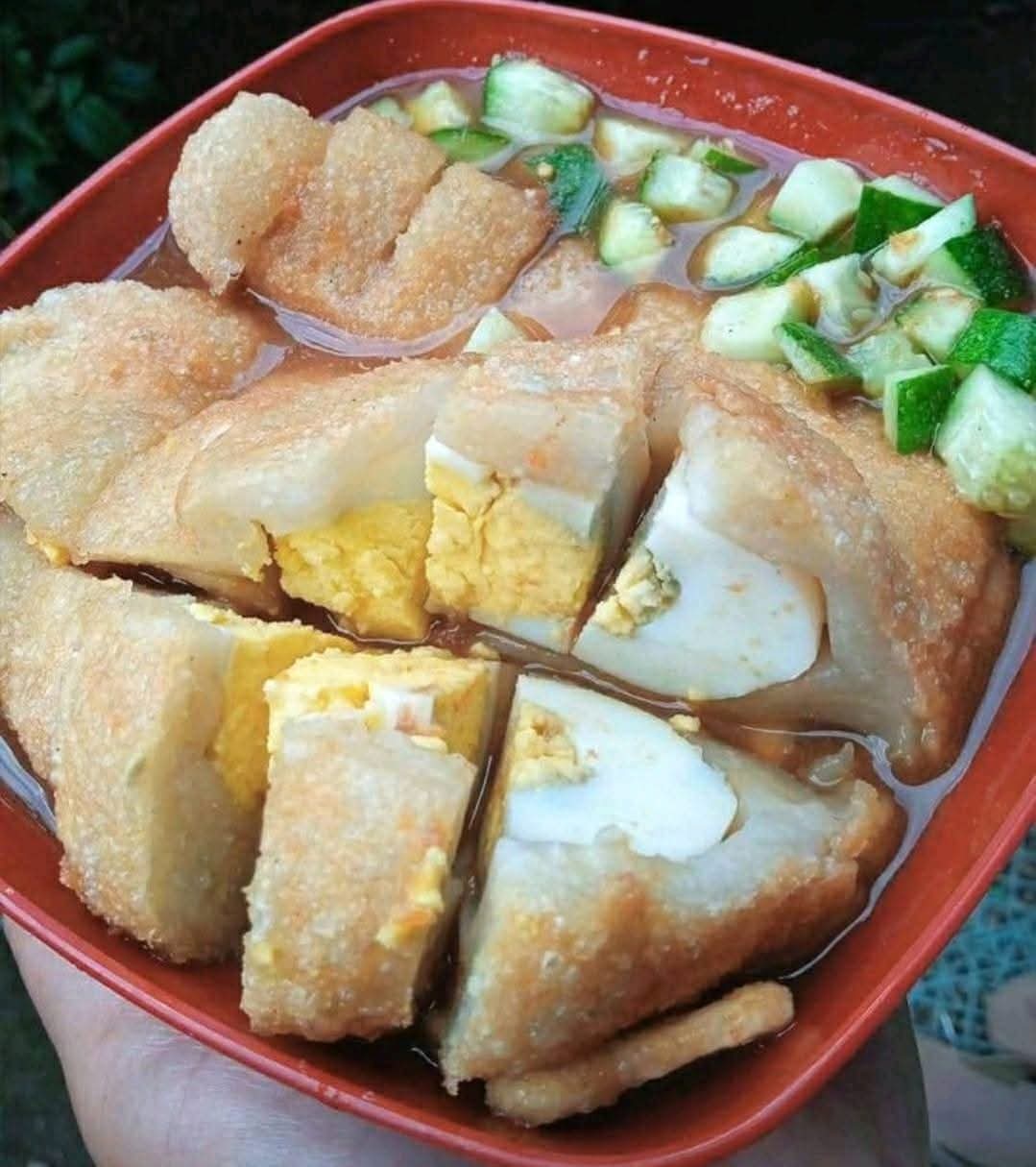 6. Sajikan: Potong pempek, beri timun cincang, tuang cuko di atasnya. Bisa ditambah mie kuning rebus kalau suka.