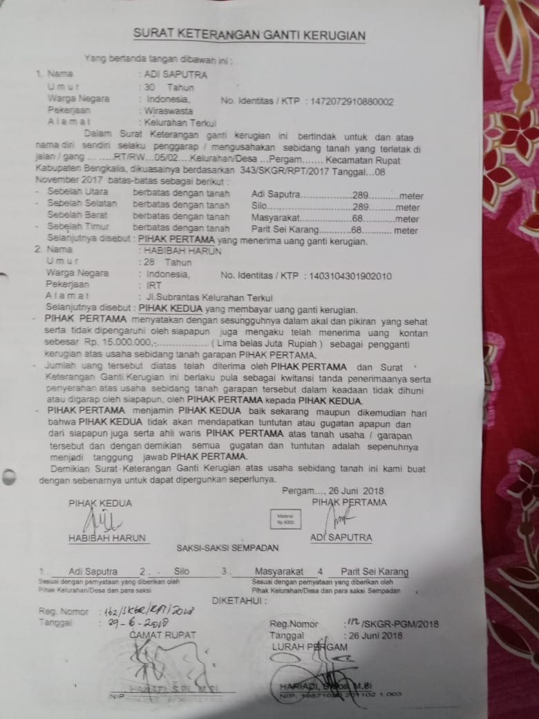 Berita kehilangan tersebut telah dilaporkan oleh pemilik Surat Tanah nama Habibah Harun ke Polsek Rupat Polres Bengkalis dengan bukti Poto copy surat tanah sebagai bukti tanda lapor kehilangan surat tanah. No Reg. Camat :162/skgr/spt 2018, tgl/24.6.2018.