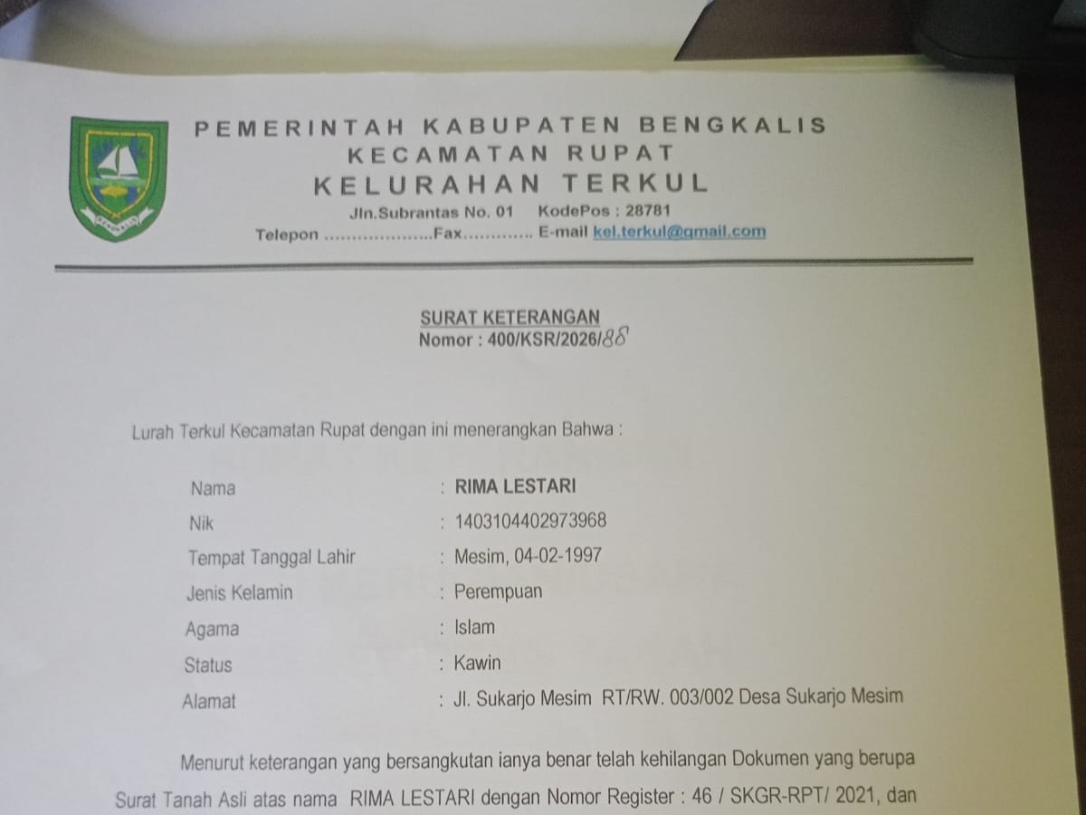 Adapun berdasarkan keterangan Rima Melati pada Rabu 12 Maret 2026. Surat diperkirakan hilang atau jatuh di wilayah Kecamatan Rupat.