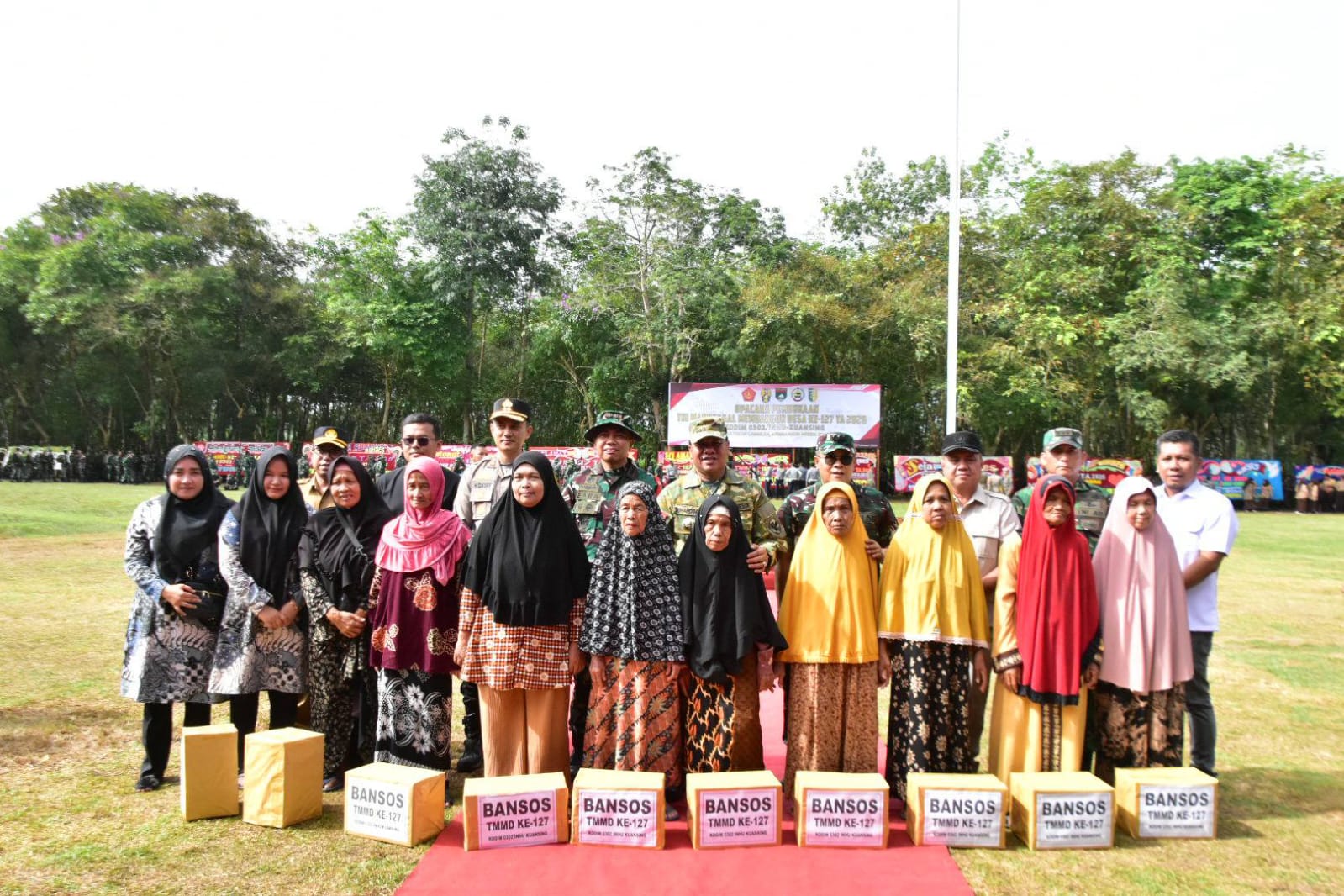 Usai upacara, Photo bersama ,Bupati Kuansing bersama rombongan Kasrem dan Dandim 0302/Inhu menyerahkan 10 paket bantuan sembako secara simbolis kepada warga, dilanjutkan kunjungan ke lokasi TMMD di Sasatan dua yakni RTLH.