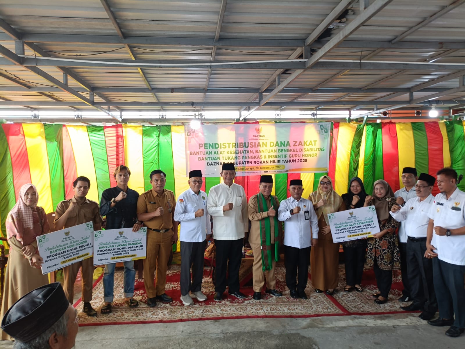 Diskominfotik Rohil – Badan Amil Zakat Nasional (Baznas) Kabupaten Rokan Hilir menyalurkan dana zakat kepada ribuan mustahik yang terdiri dari guru honorer, pelaku usaha kecil, dan penyandang disabilitas dalam kegiatan pendistribusian yang digelar di Kantor Baznas Rohil, Selasa (30/12/2025) di Bagansiapiapi, Kabupaten Rokan Hilir, Riau.