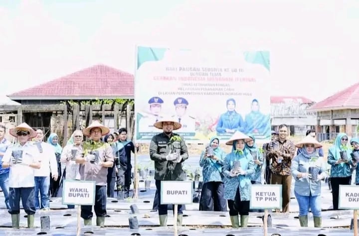 INHU, Kompas 1 net – Peringati Hari Pangan Sedunia yang Ke 80, Bupati Indragiri Hulu Ade Agus Hartanto didampingi Ketua TP PKK, Suci Rahmiani juga bersama Wakil Bupati Hendrizal serta Jajaran Forkopimda melakukan ‘Gerakan Indonesia Menanam ‘sebagai bentuk menjaga ketahanan pangan, Kamis (16/10/2025).