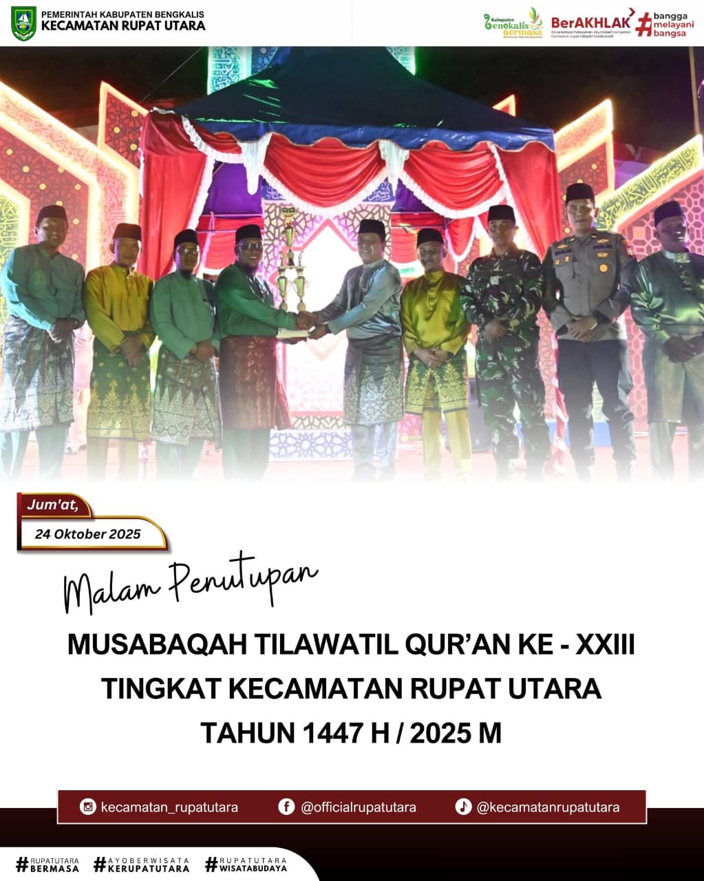 Rupat Utara, Kompas 1 net – Musabaqah Tilawatil Qur’an (MTQ) ke-XXIII Tingkat Kecamatan Rupat Utara resmi ditutup oleh Camat Rupat Utara, Bapak Aulia Fikri, pada Jum’at malam, 24 Oktober 2025, bertempat di halaman Medang Perkasa Kantor Camat Rupat Utara.