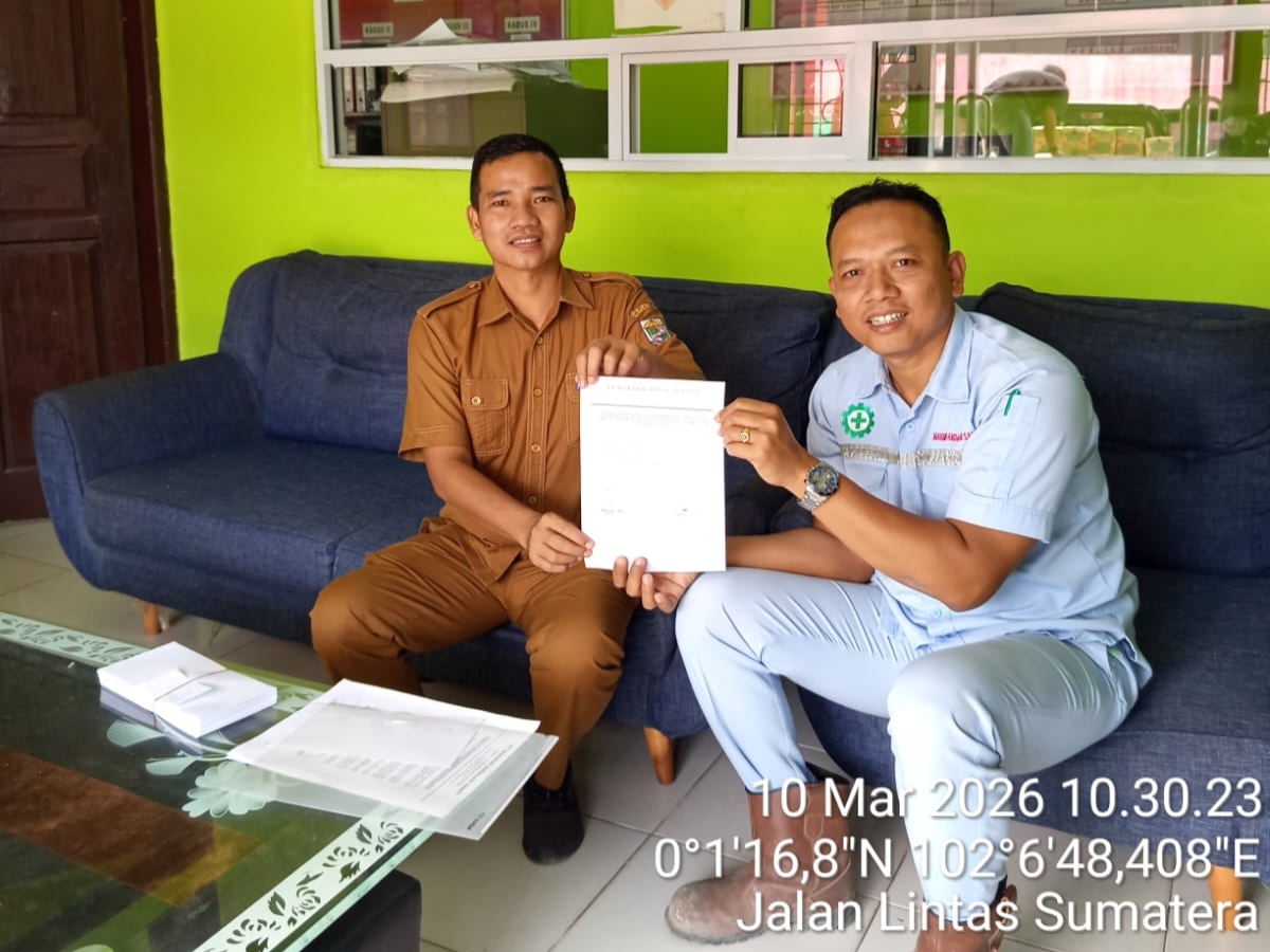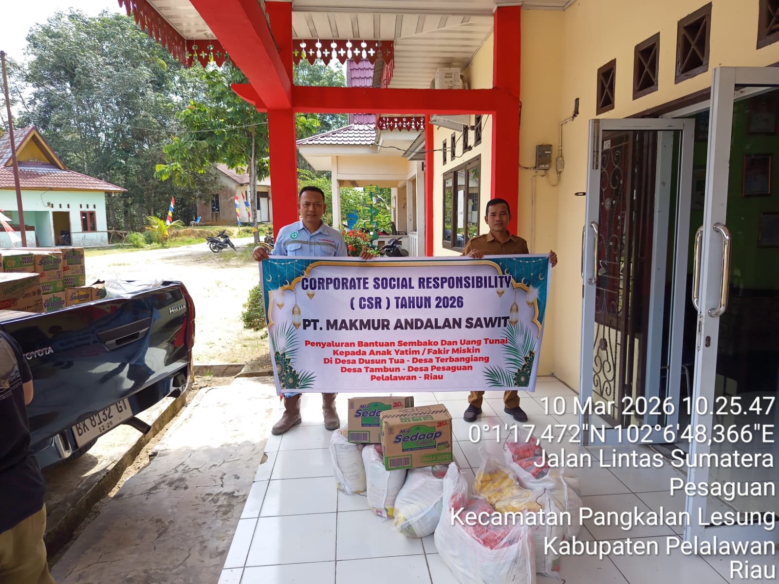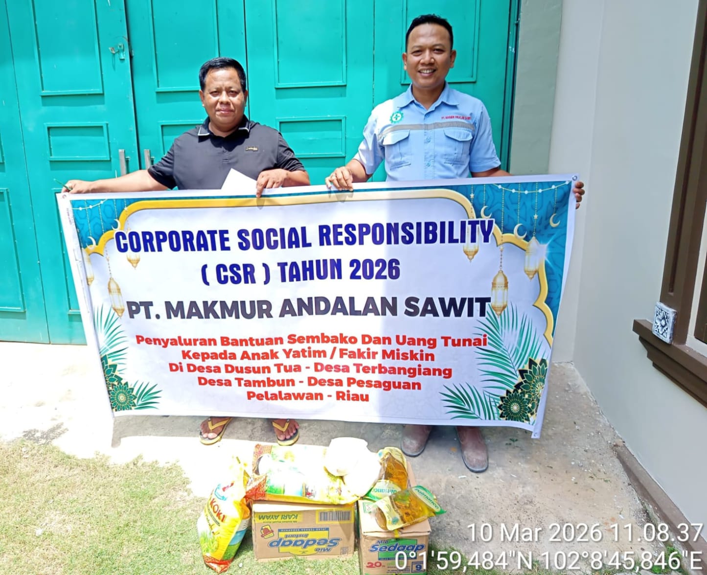 Pada Foto : Manajemen PT MAS, Irham Lubis, S.H. (Kanan) Kades Tambun Hendri (Kiri) saat menyalurkan bantuan, Selasa (10/03/26)