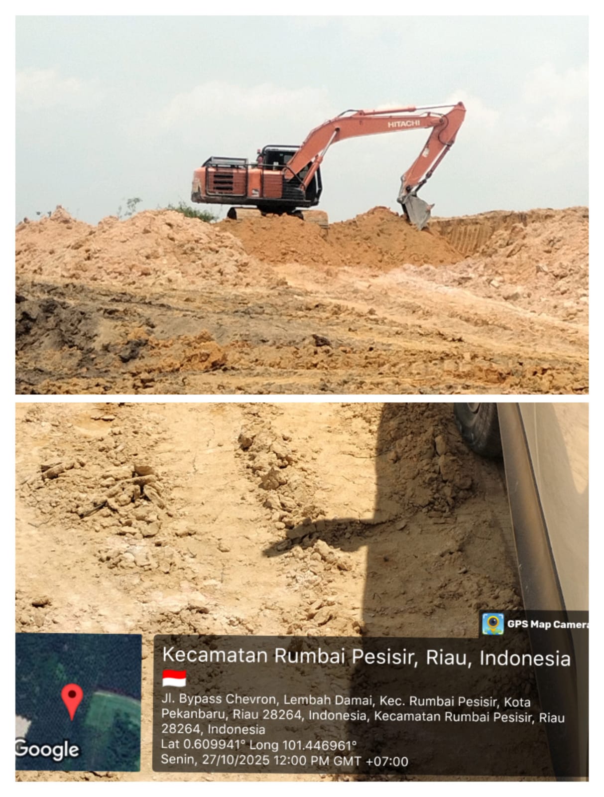 Pekanbaru, Kompas 1 net – Aktivitas galian tanah berskala besar kembali terlihat di wilayah Kecamatan Rumbai Pesisir, Kota Pekanbaru, tepatnya di kawasan Lembah Damai hingga Jl. Bypass Chevron. Dua titik lokasi terpantau menggunakan alat berat jenis excavator melakukan pengerukan tanah, debu debu beterbangan dan tanah dibawa truk-truk pengangkut. Senin 27 Oktober 2025.