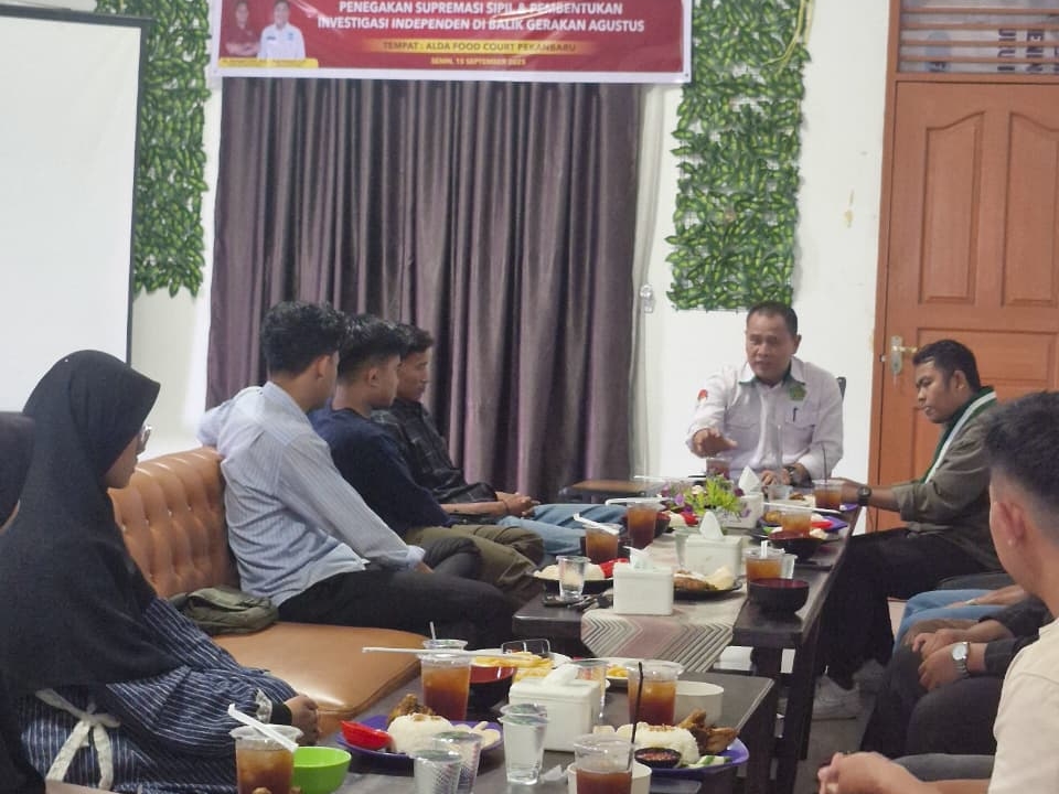 Pekanbaru, Kompas 1 net – Senin,15 September 2025, bertempat di Alda Food court Pekanbaru, KAMMI Riau mengadakan diskusi publik bertema “Penegakan Supremasi Sipil & Pembentukan Investigasi Independen di balik Gerakan Agustus” bersama bapak Dosen Dr. Harmaini dan tokoh aktivis senior Riau..