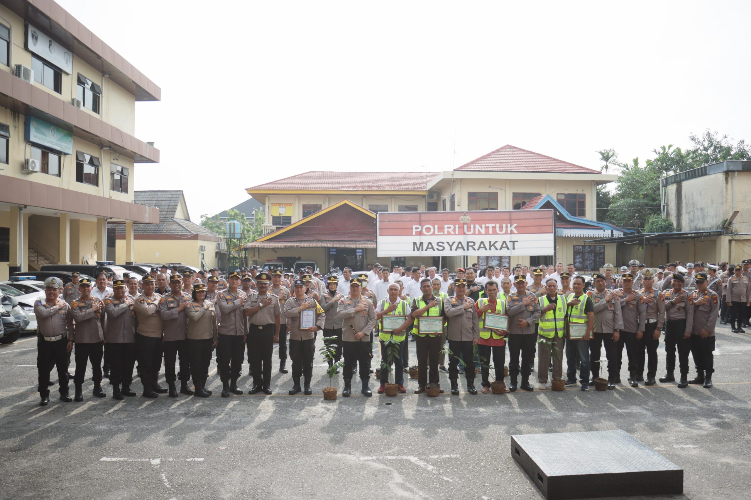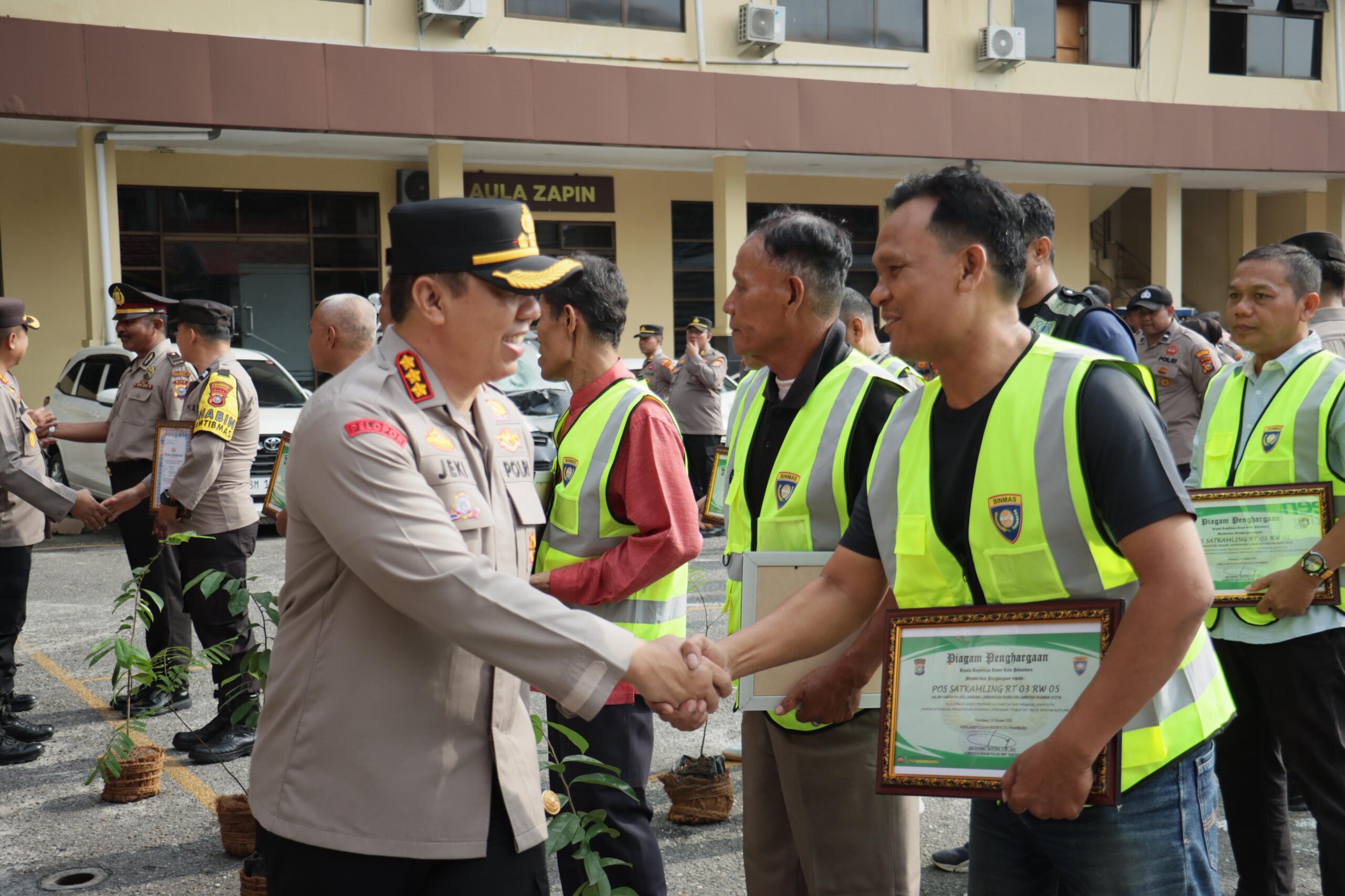 Selain itu, Aiptu Azwar Anas, Bhabinkamtibmas Kelurahan Labuh Baru Barat Polsek Payung Sekaki, menerima piagam penghargaan dan bibit pohon atas dedikasinya dalam pembangunan Dapur SPPG (Satuan Pelayanan Pemenuhan Gizi) — fasilitas terpusat untuk produksi Makan Bergizi Gratis (MBG) di wilayah hukum Polresta Pekanbaru.