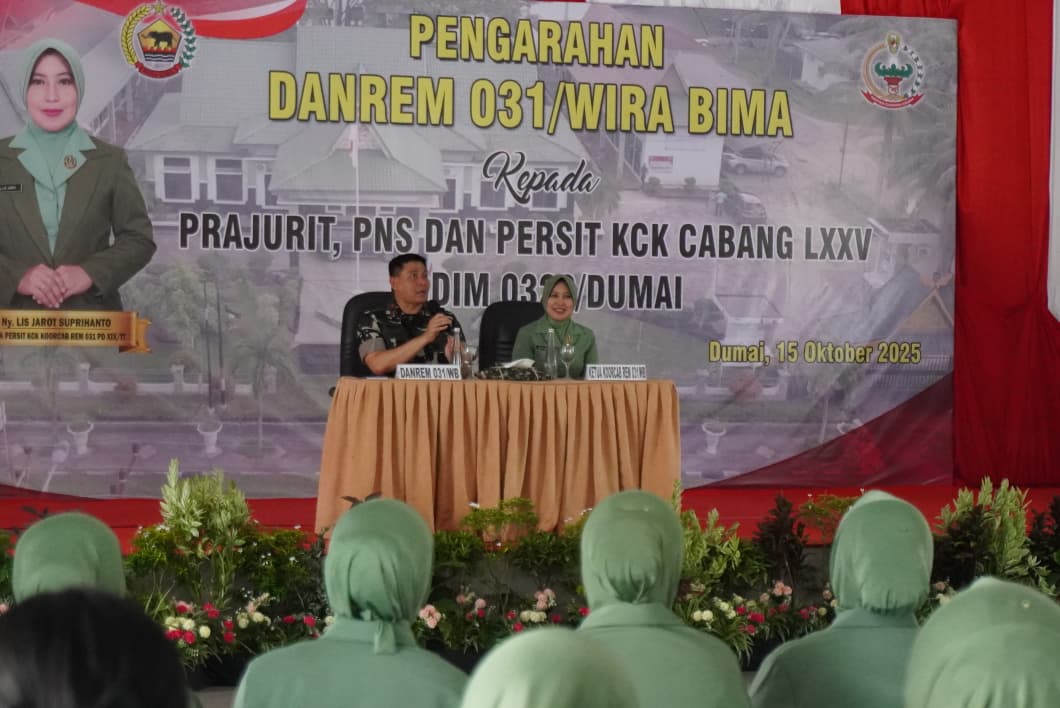 DUMAI, Kompas 1 net – Komandan Korem 031/Wira Bima, Brigjen TNI Jarot Suprihanto, melaksanakan kunjungan kerja ke Kodim 0320/Dumai dalam rangka memberikan pengarahan kepada prajurit dan PNS jajaran Kodim. Dalam kegiatan ini, Danrem turut didampingi oleh Ketua Persit Kartika Chandra Kirana Koorcab Rem 031 PD I/Bukit Barisan, Ny. Jarot Suprihanto, beserta pengurus,Rabu 15/10/25.