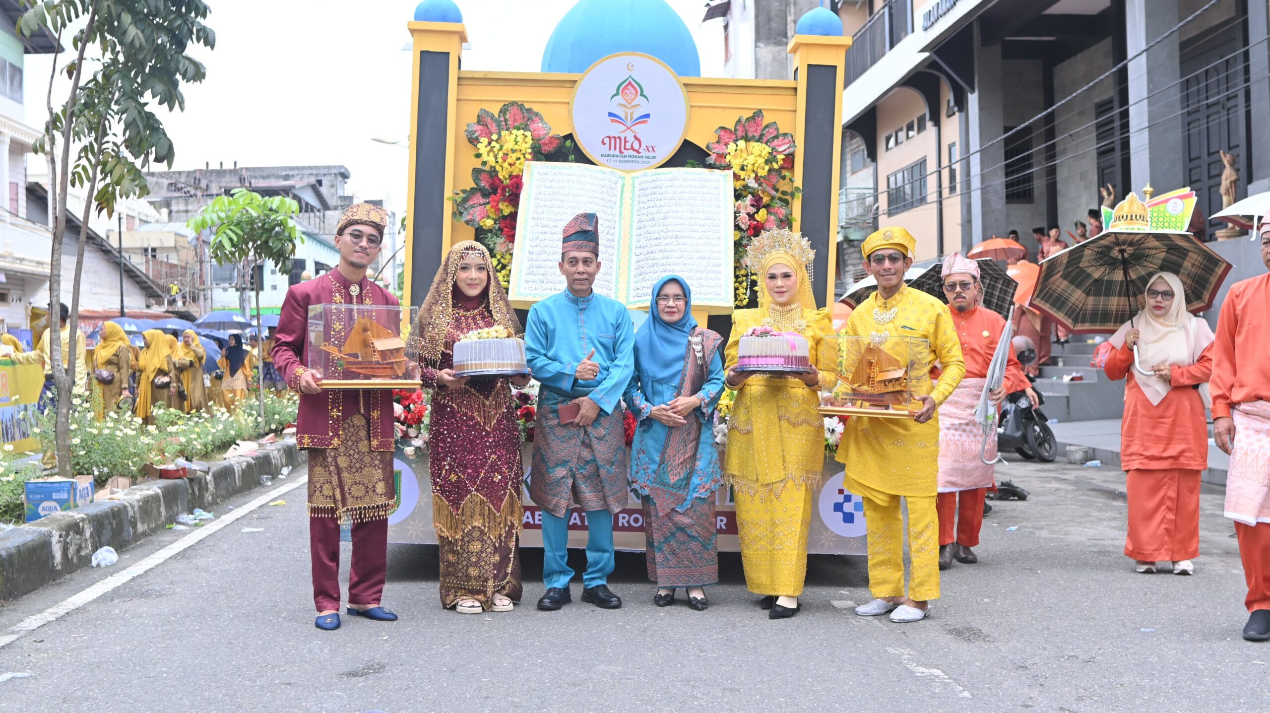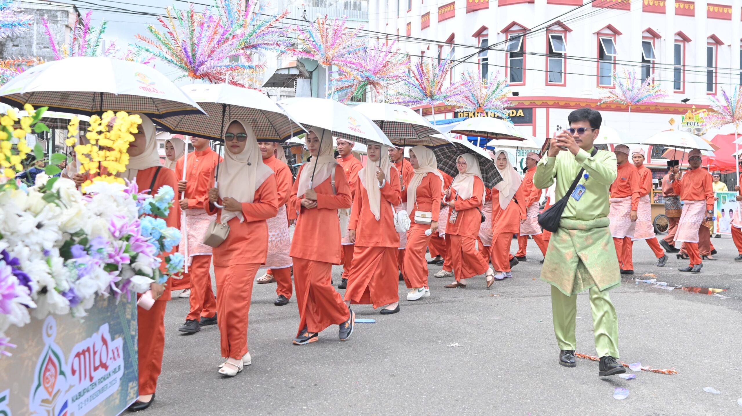 Para peserta tampil kompak mengenakan busana Melayu lengkap dengan sarung songket dan tanjak, memberikan kesan meriah dan elegan. Penampilan semakin semarak dengan penggunaan payung berhias bunga manggar yang tampak berkilau sepanjang rute pawai.
