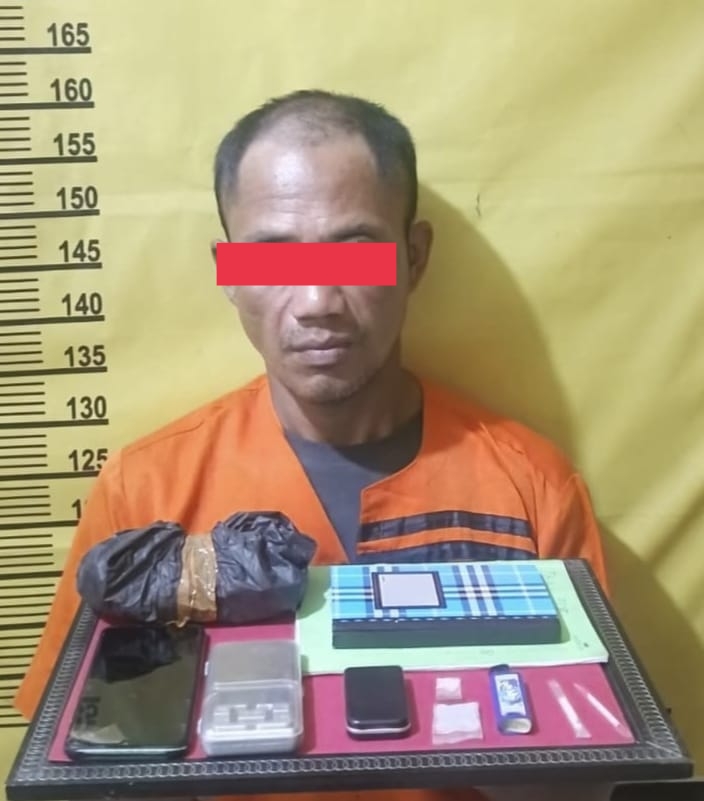 “Setelah dilakukan penyelidikan dan penggerebekan disaksikan Ketua RT setempat, tersangka berhasil diamankan di dalam rumah. Saat penggeledahan ditemukan dua plastik klip bening berisi serbuk kristal diduga sabu yang disimpan di dalam mancis warna biru di saku celana tersangka,” jelas Aiptu Misran.