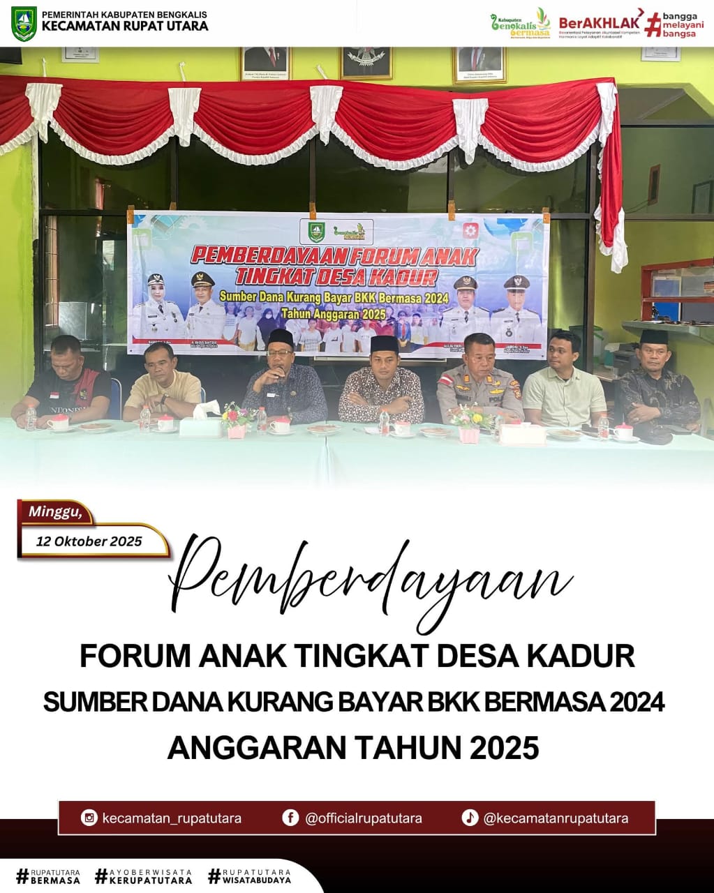 Bengkalis, Kompas 1net – Pemerintah Desa (Pemdes) Kadur, Kecamatan Rupat Utara, Kabupaten Bengkalis, menyelenggarakan Kegiatan Pemberdayaan Forum Anak Tingkat Desa pada Minggu, 12 Oktober 2025, bertempat di Aula Kantor Desa Kadur.