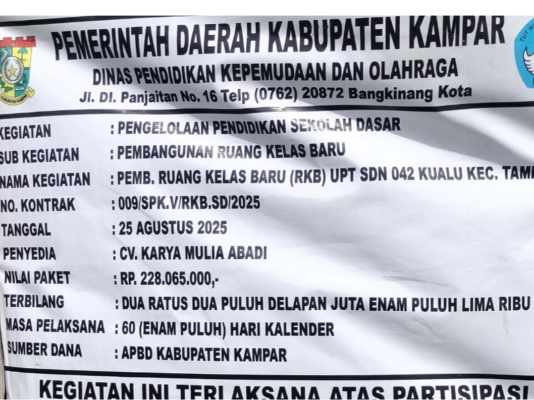 Kampar, Kompas 1 net – Pengerjaan pembangunan Ruang Kelas Baru (RKB) di UPT SDN 042 Kualu, Kecamatan Tambang, Kabupaten Kampar yang dibiayai dari APBD Kampar senilai Rp228 juta kini menuai sorotan tajam.