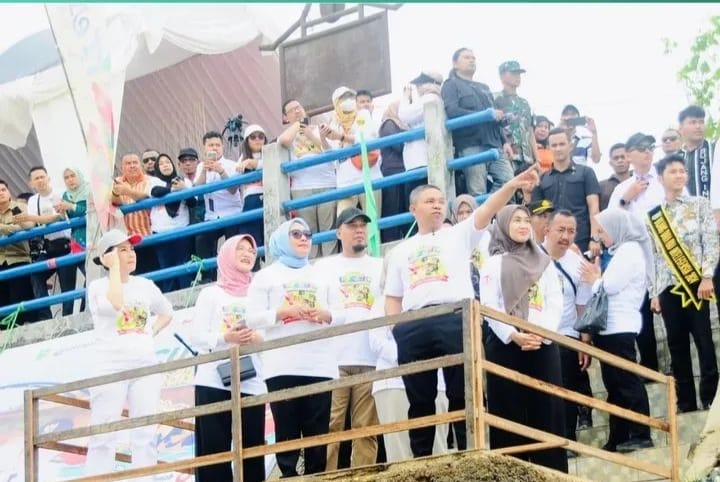 Bupati Indragiri Hulu Ade Agus Hartanto mengajak Menteri Pemberdayaan Perempuan dan Perlindungan (PPPA) Arifah Fauzi dan Gubernur Riau Abdul Wahid beserta rombongan Melepas Lomba Pacu Sampan Tradisional Zona 1 yang diadakan di Tepian Sungai Indragiri, Rabu (23/7/25).