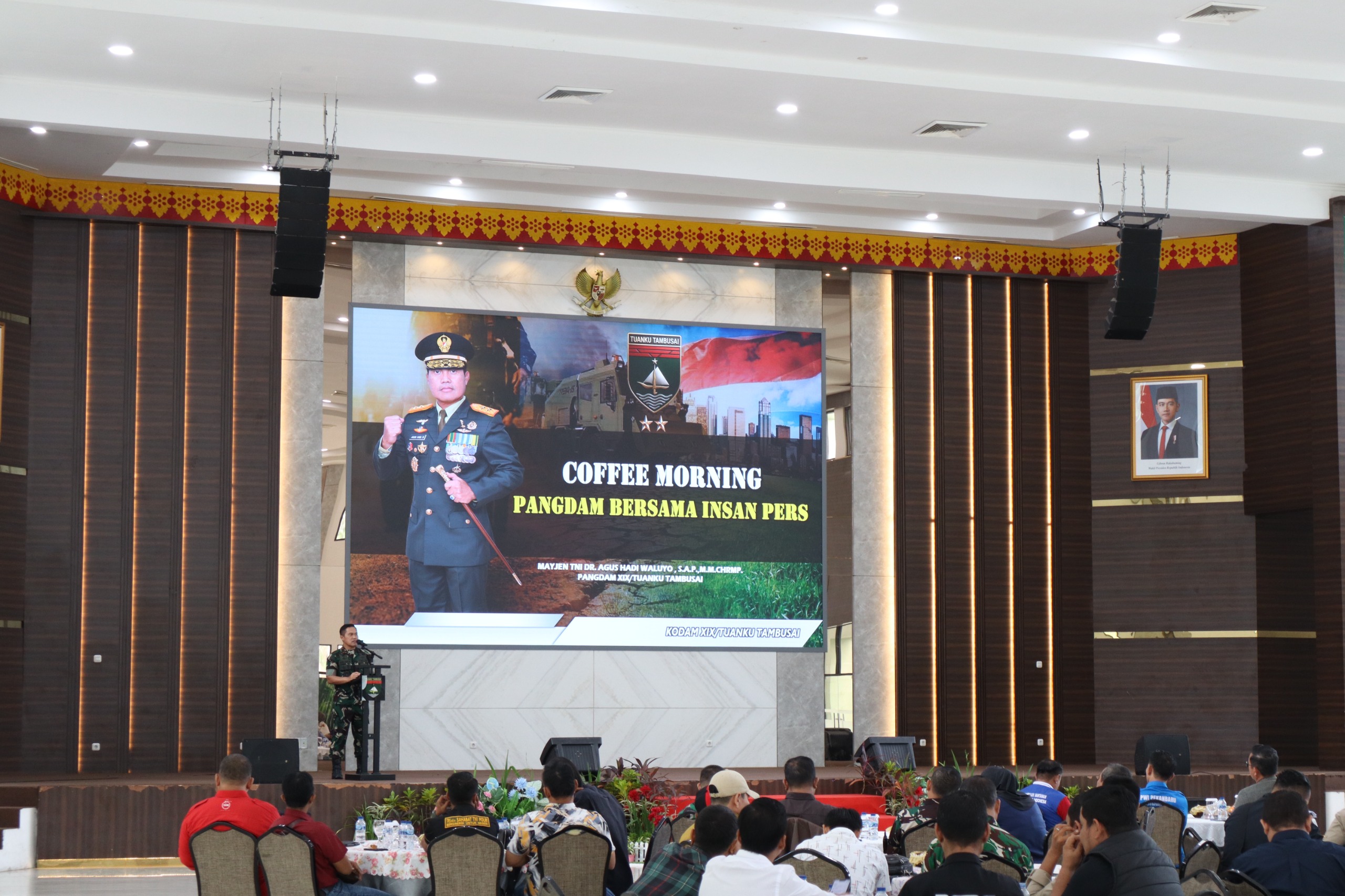 Acara tersebut dipimpin langsung oleh Pangdam XIX/Tuanku Tambusai Mayjen TNI Dr. Agus Hadi Waluyo, S.A.P., M.M., CHRMP, serta dihadiri Kasdam XIX/TT, Irdam, Kapoksahli Pangdam, para Asisten Kasdam, dan para Dan/Kabalak jajaran Kodam XIX/TT. Turut hadir Ketua PWI Provinsi Riau beserta insan pers dari berbagai media cetak, elektronik, dan daring.