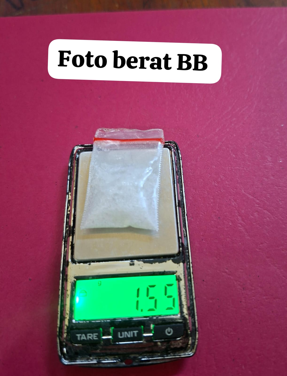 Barang bukti disita : 1 paket plastik bening berisi kristal diduga sabu seberat kotor 1,55 gram dan 1 HP Infinix hitam yang dipakai untuk transaksi.