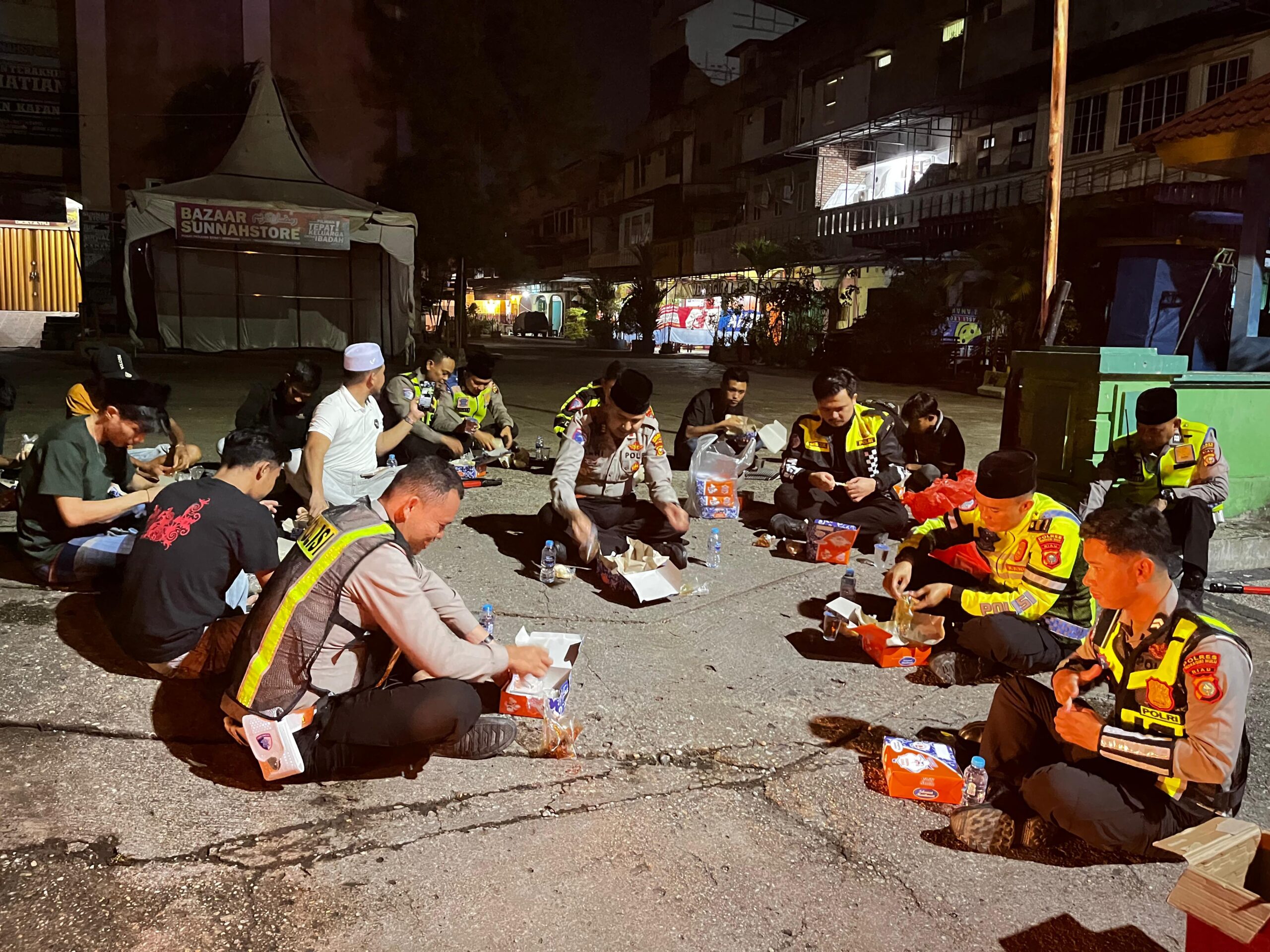 Suasana hangat pun tercipta saat polisi dan masyarakat duduk bersama menikmati santap sahur sederhana di pinggir jalan.