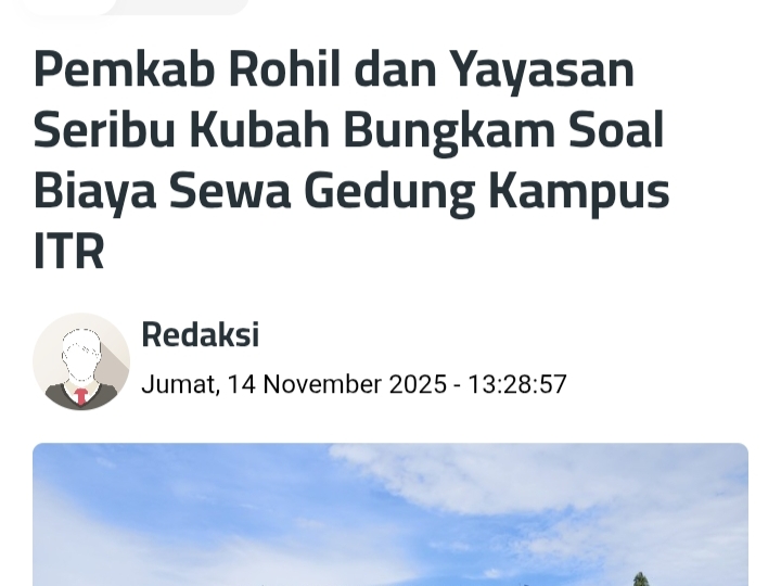 Untuk diketahui sebelumnya media online Mimbarriau.com menyoroti Kampus ITR Rohil dengan judul Pemkab Rohil dan Yayasan Seribu Kubah Bungkam Soal Biaya Sewa Gedung Kampus ITR.