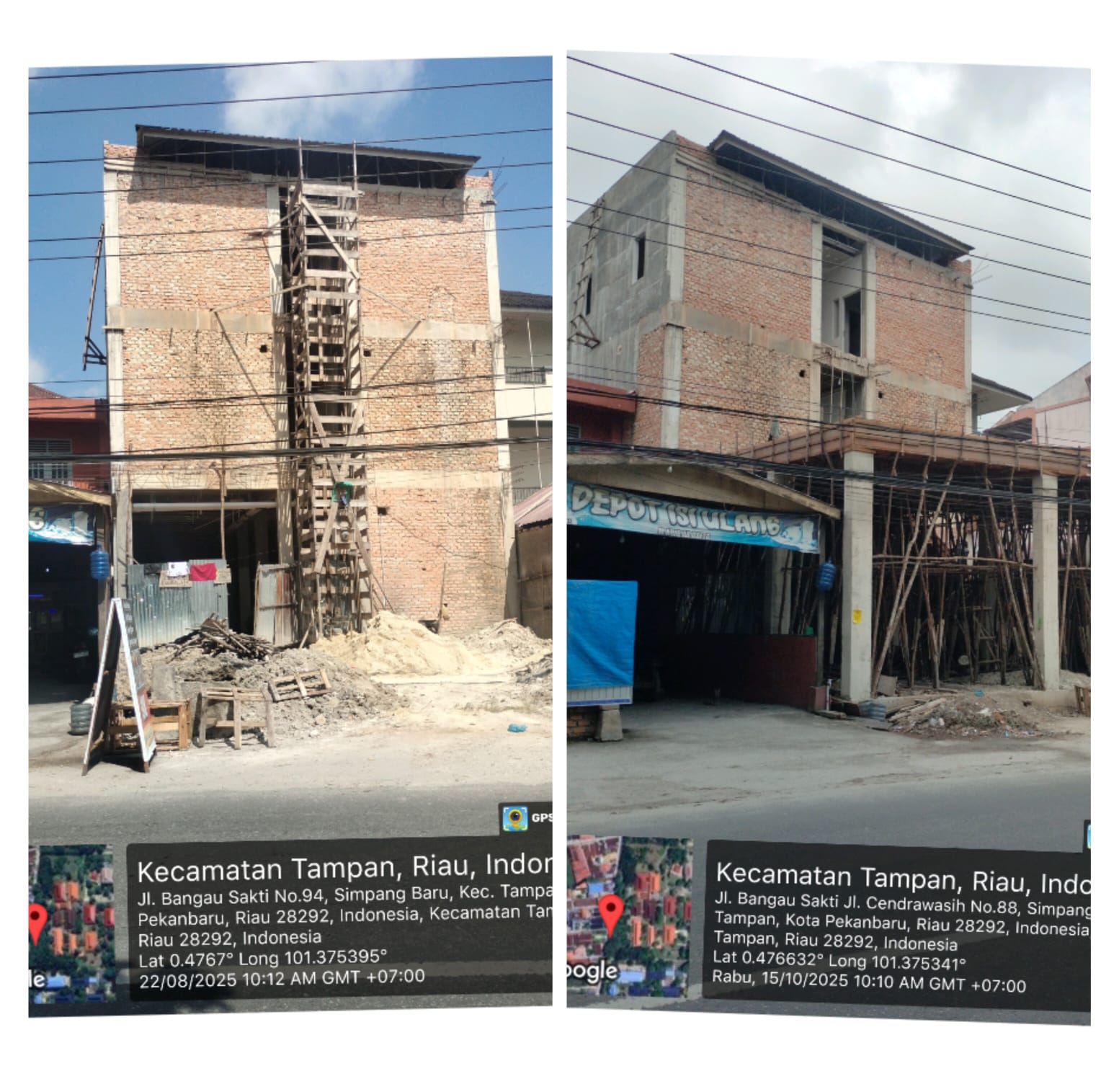 Pekanbaru, Kompas 1 net – Sudah lebih dari dua minggu sejak isu pelanggaran Garis Sempadan Bangunan (GSB) di Jalan Bangau Sakti, Simpang Baru, Kecamatan Binawidya, Kota Pekanbaru mencuat ke publik. Namun hingga Rabu, 15 Oktober 2025, bangunan ruko yang diduga tak memiliki PBG dan menyalahi aturan tata ruang itu tetap berdiri kokoh.